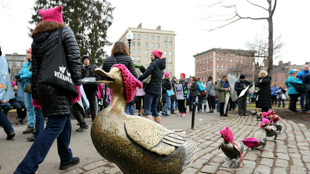 The cat-eared, pink knitted hats from The Pussyhat Project made their way to the famous Make Way for Ducklings statues ahead of the Boston Women’s March on Saturday.